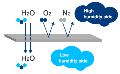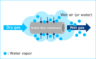 When dry air (gas) is supplied to the inside of the membrane and moist air (gas) is supplied outside the membrane, the moisture moves through the membrane to the drier air (gas) inside, producing humidified air (gas).
