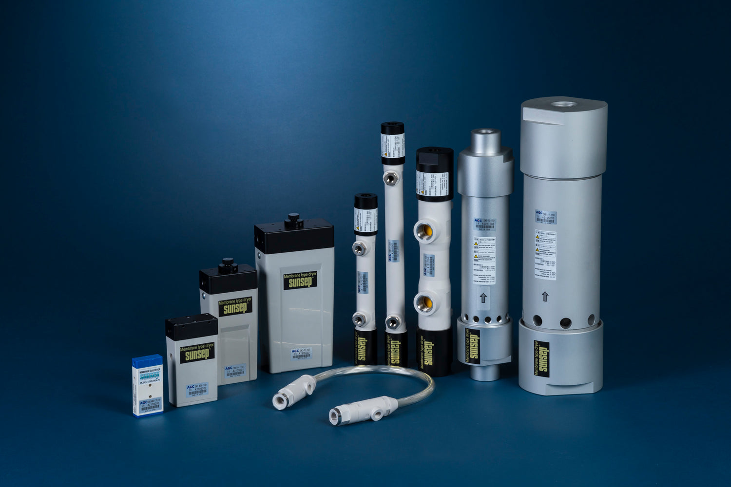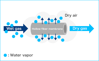 When wet air (gas) is supplied to the inside of the membrane and dry air (gas) is supplied outside the membrane, the moisture moves through the membrane to the drier air (gas) outside, producing dry air (gas).
